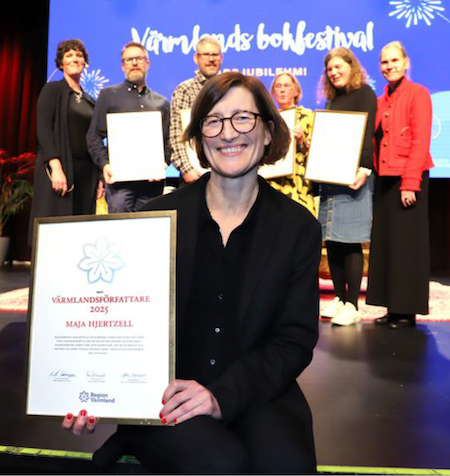 Maja Hjertzell på Värmlands bokfestival 2025. Foto: Lena Richardson/NWT Till Årets Värmlandsförfattare hade Maja Hjertzell utsetts med motiveringen: Hon har hittills i åtta böcker under 2000-talet låtit barn och ungdomar berätta för oss om sina relationer till föräldrar, klasskamrater, syskon, pojk- och flickvänner. Det är välskrivet och samtiden är lyhört fångad. Och man läser – spänd på hur historierna ska utvecklas! Priset har delats ut av Region Värmland sedan 2003, i syfte att lyfta fram författarskap med stark koppling till Värmland. Maja Hjertzell föddes i Eskilstuna och har nyligen flyttat till Stockholm, men bodde under många år i Arvika (faktiskt i ett antal av dem i samma hus där hemsidesredaktören, själv Årets värmlandsförfattare 2017, växte upp) där hon dels skrev böcker, dels arbetade som gymnasiebibliotekarie. Pristagaren utses av en jury och får 30 000 kronor. Årets jury bestod av Helena Vermcrantz, Lennart Wettmark, Peter Olausson samt Mas Karin Gustafsson. Den ärofyllda utmärkelsen får man för hela sitt författarskap, vilket alltså för Majas del betyder åtta barn- och ungdomsböcker. Den senaste, Brorsans kompis Robban, var Augustnominerad 2024. Tillsammans med illustratören Joanna Hellgren mottog hon i år Nils Holgersson-plaketten för samma bok. – Det känns stort att vara erkänd som Värmlandsförfattare. Kärleken till Värmland är besvarad, säger Maja Hjertzell. Maja har alltid läst mycket, berättar hon i Region Värmlands nyhetsflöde. Att hon blev författare säger hon beror på uppmuntran. – Om någon säger att du är duktig på att skriva så är det är det större chans att det är den vägen man fortsätter på. Hon tänker framför allt på gymnasieläraren som tog diktskrivarna på allvar, på kursen Kreativt skrivande på universitetet i Umeå och när hon vann en novelltävling som tidningen Fönstret hade. 2001 deltog hon i en barnbokstävling som Rabén & Sjögren utlyste. Den vann hon inte men förlaget antog hennes manus och den första boken skapades. – Anledningen till att jag skriver är också att jag tycker vansinnigt mycket om att formulera mig i text, att hålla på med stil och ordval och ton. Frågorna och känslorna styr Hennes författarskap börjar med en känsla, en fråga, eller något som är svårt att förhålla sig till. Det är där berättelserna tar form och hon säger att resultatet blir realistiska samtidsskildringar. – Det är frågorna och känslorna som styr och hittills har det varit teman som passar barn och unga. Innehållet är frågor som jag grubblar över, jag söker efter förhållningssätt till sådant som har med relationer, samhällsproblem och existentiella frågor att göra – ja frågor om det obegripliga livet. Skrivandet blir ett sätt att tänka och försöka formulera de där frågorna. – Det har ibland handlat om hur man ska kunna veta vad man känner och vill, hur man ska kunna och våga uttrycka det högt. Ibland är det en karaktär som jag hittar som gör att jag vill skriva. I senaste boken började jag fundera över ironi och det ledde mig till berättelsen. En av de första böckerna tog avstamp i blyghet – ett ämne som utmanade henne. Andra exempel är “Hur är det att leva i ett samhälle där den sociala kontrollen är stark, där alla vet allt om alla? Och hur påverkar det en ung människa att växa upp i en familj som inte tillhör eller beter sig som medelklass”. Ska jag stanna kvar i småstaden för att jag vill – eller ska jag flytta för att normen säger att jag bör göra det. Som gymnasiebibliotekarie har hon kommit nära unga människor och deras funderingar och en del impulser som exempelvis kroppsspråk och uttryckssätt har hon tagit med sig till sina berättelser. Hur hinner du skriva? – Jag har varit tjänstledig periodvis tack vare stipendier från Sveriges författarfond. Hade ett frihalvår när den möljigheten gavs och annars är det på helger och semestrar. Från Arvika till Stockholm I våras flyttade Maja Hjertzell från Arvika där hon bott och verkat som gymnasiebibliotekarie i 20 år. Flytten gick till Stockholm och hon jobbar nu på en biblioteksfilial i Täby. Nyfikenheten på att få mer av Stockholm har växt fram, inte minst när hon de senaste åren haft uppdrag från Sveriges författarfond och besökt huvudstaden regelbundet. Förr eller senare hade nog flytten blivit av. När tjänsten på gymnasiet drogs ner till 75 procent så hjälpte det till att ta ett stort beslut. Under 20 år så har hon hunnit bli väldigt mycket värmlänning och stugan i Gunnarskog utanför Arvika förbli en viktig plats att återkomma till. Platsen upptäckes för länge sedan av Majas mormorsmor och släkten har fortsatt att trivas där. En ny fin uppmuntran Priset betyder oerhört mycket för henne. Vi är åter där vi började – en ny värdefull uppmuntran som ger motivation att fortsätta berätta och som stärker i stunder av tvivel på den egna förmågan. Och så är det där med känslorna för Värmland. – För mig betyder det också att jag har blivit godkänd som värmlänning. Jag har blivit insläppt och jag blir rörd när jag tänker på det. Årets litteraturstipendiater Region Värmlands litteraturstipendium har delats ut sedan 2008. Syftet med stipendiet är att lyfta fram enskilda titlar av hög kvalitet ur det senaste årets utgivning av litteratur med Värmlandsanknytning. Stipendiet kan ges till både skön- och facklitteratur. En jury utser pristagarna. Årets juryn bestod av Helena Vermcrantz, Lennart Wettmark, Peter Olausson och Mas Karin Gustafsson. Stipendiet är på 75 000 kronor och fördelas mellan 2–5 litteraturpristagare. Region Värmlands litteraturstipendium delades 2025 mellan fyra författare.